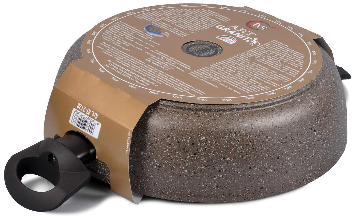 Товар произведён фирмой TVS на заводе в Италии по заказу Российской компании "ТимА". В связи с этим на упаковке товара логотип фирмы TVS, на дне посуды логотип компании "ТимА" и надпись Made in Italy.